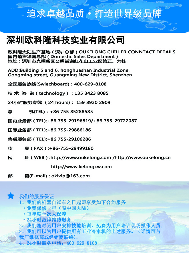 公司是一家集設計研發、產品生產、市場營銷、技術服務為一體的大型專業冷水機產品制造企業,主營工業冷水機組、低溫冷水機、風冷式冷水機,工業冷水機|風冷式工業冷水機|工業用冷水機,冷水機價格_冷水機_冷水機組_低溫工業冷水機,冷水機生產廠家專注于工業冷水機研發與生產行業領先品牌。公司主營:冷水機,工業冷水機,螺桿式冷水機,風冷/水令式冷水機,低溫冷水機,模溫機等非標機型定制。